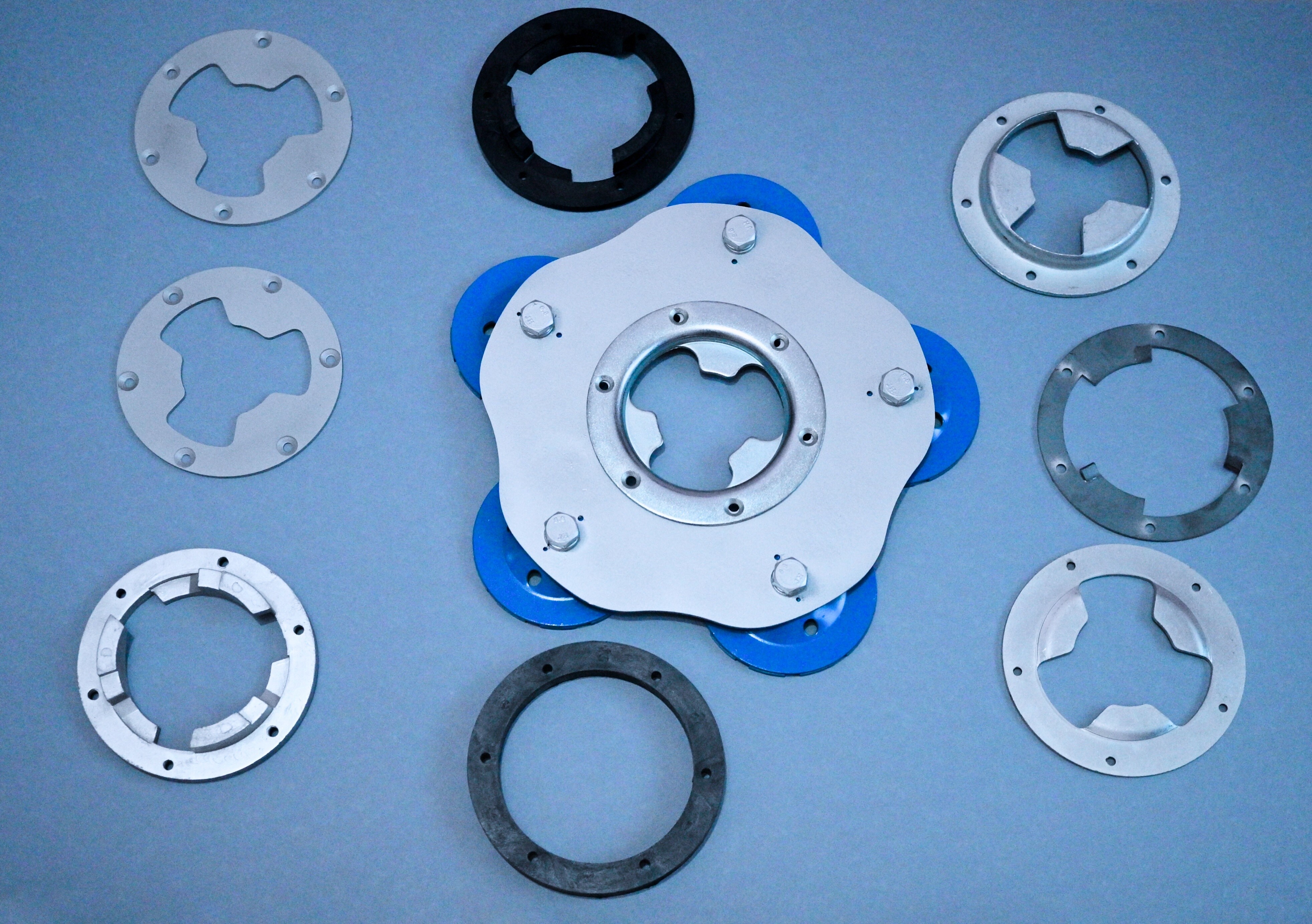 Uniwersalny potrójny dysk z przekładnią planetarną na papiery f150. Skonstruowany ze specjalnej stali przekładniowej (16HG/1.7131/16MnCr5 nadaje się na elementy maszyn z wymaganą warstwą wierzchnią o dużej twardości i ciągliwym rdzeniu, koła zębate, ślimaki, sworznie, tuleje, wałki rozrządu, o niedużych wymiarach, podlegające średnim obciążeniom) do zębatek o zwiększonej wytrzymałości na ścieranie i temperaturę. Dzięki tej konstrukcji staje się bardziej uniwersalny i można go stosować w maszynach o mocy mniejszej niż 1500W.